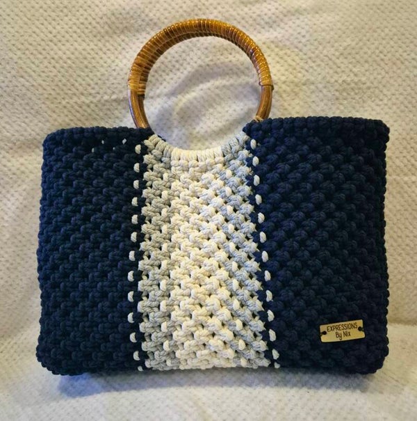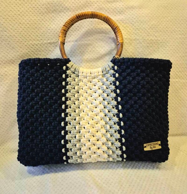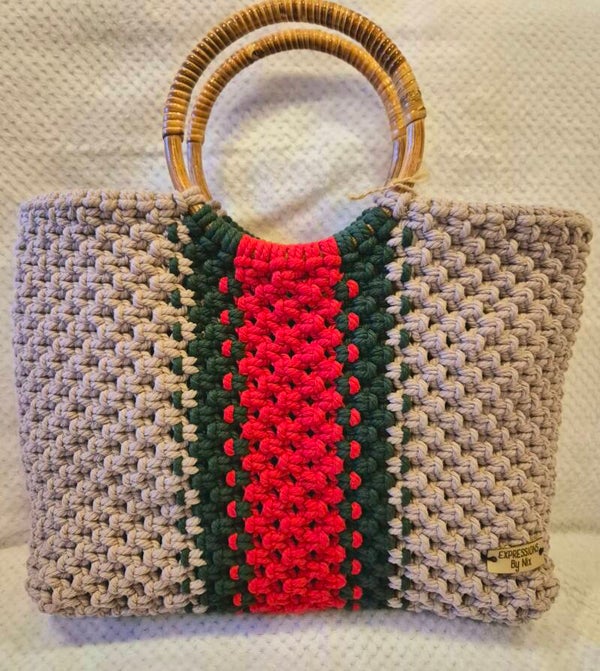 Purely handmade. Made with cotton cords and with bamboo handle.