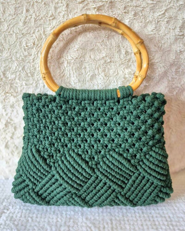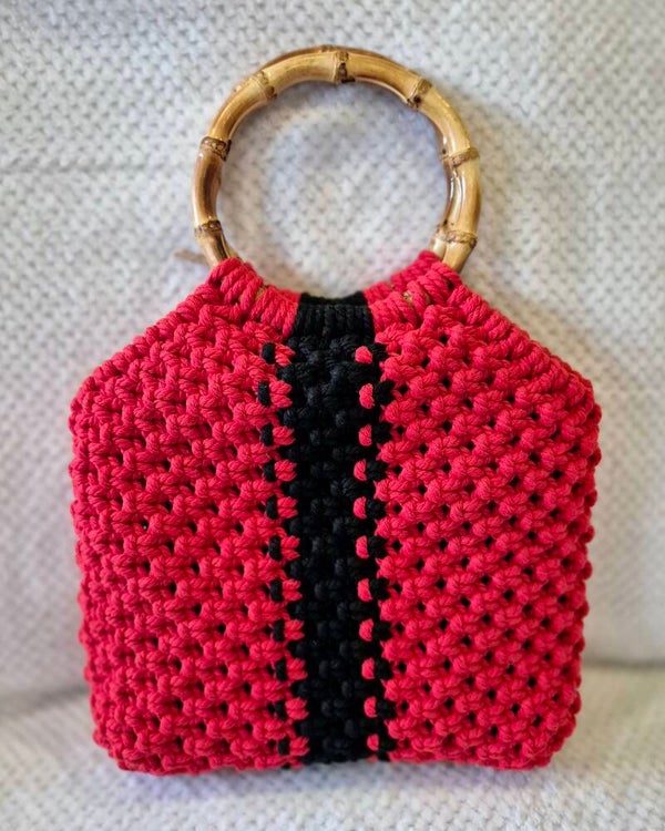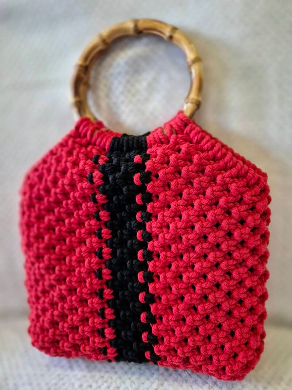 Purely handmade. Made with cotton cords and with bamboo handle.