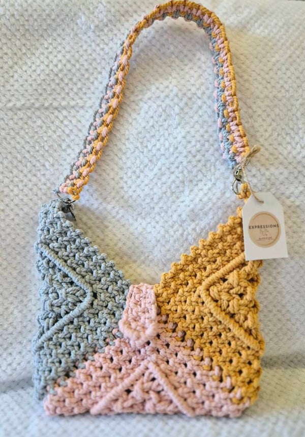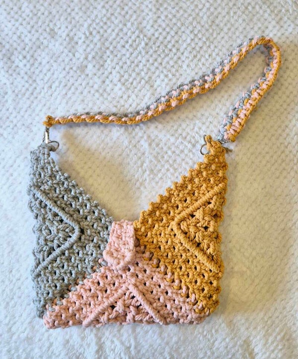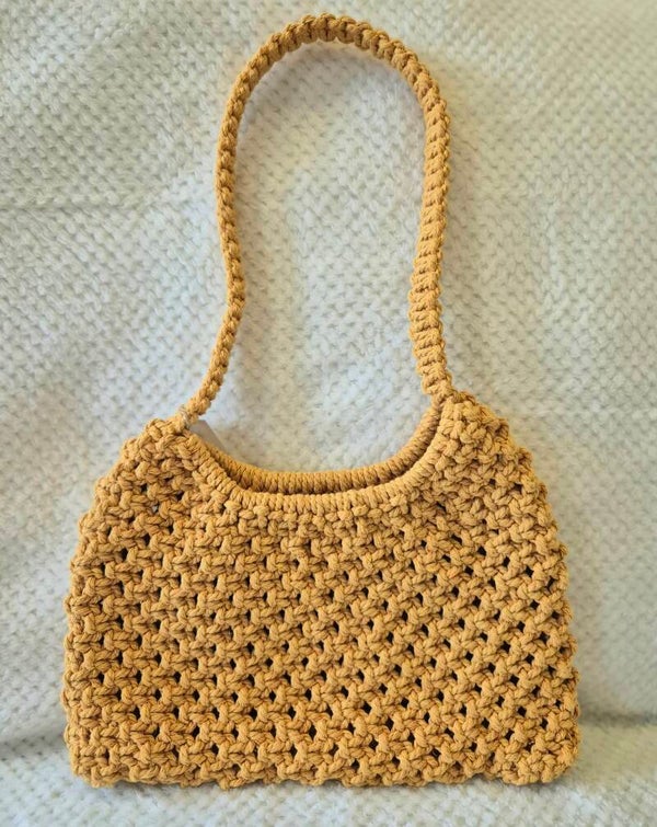 Purely handmade. Made with cotton cords and with bamboo handle.